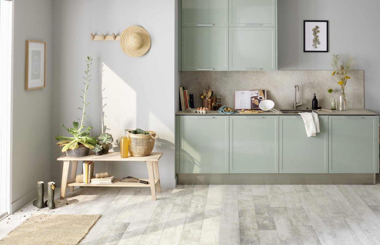 60% de PVC recyclé (formule brevetée), bois issu de forêts gérées durablement, chutes valorisées en façades de cuisine et portes de placard.