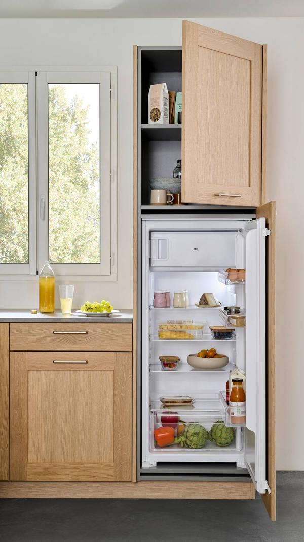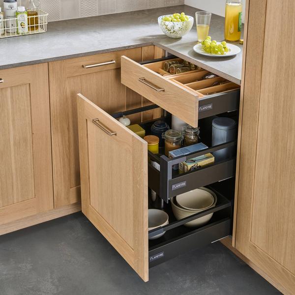 Rangement optimisé pour tout vos produits alimentaires. Pour se rendre compte de la qualité de nos meubles, passez voir nos experts cuisines en magasin.