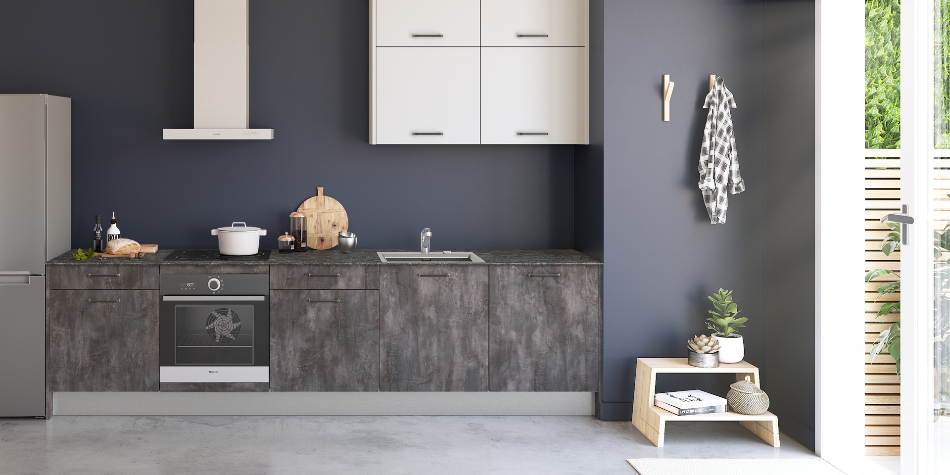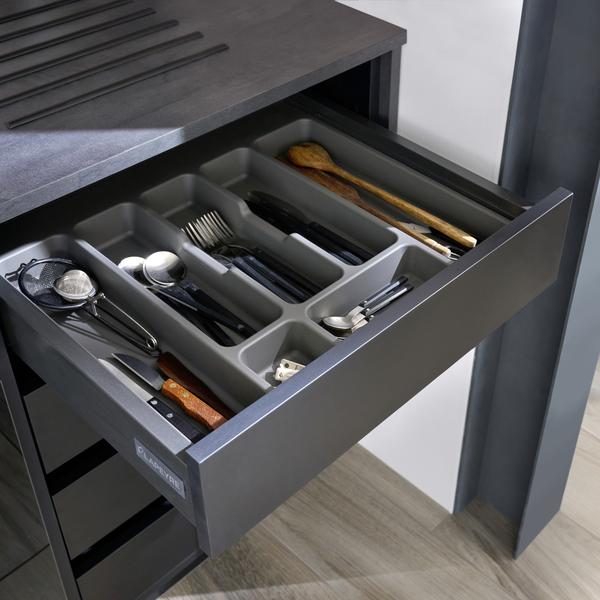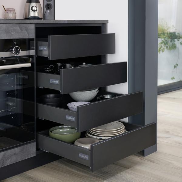 Tendance industrielle, avec l'effet ardoise anthracite. Pour se rendre compte de la qualité de nos meubles, passez voir nos experts cuisines en magasin
